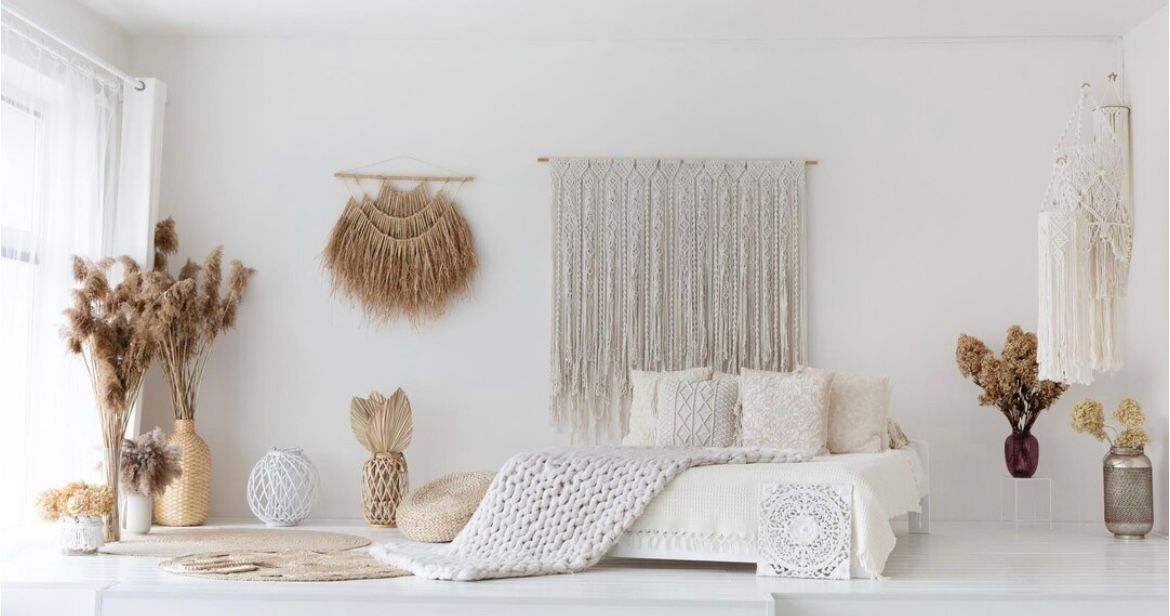 Wandcompositie in bohemian stijl van bamboe, rotan en macramé - Ronko
